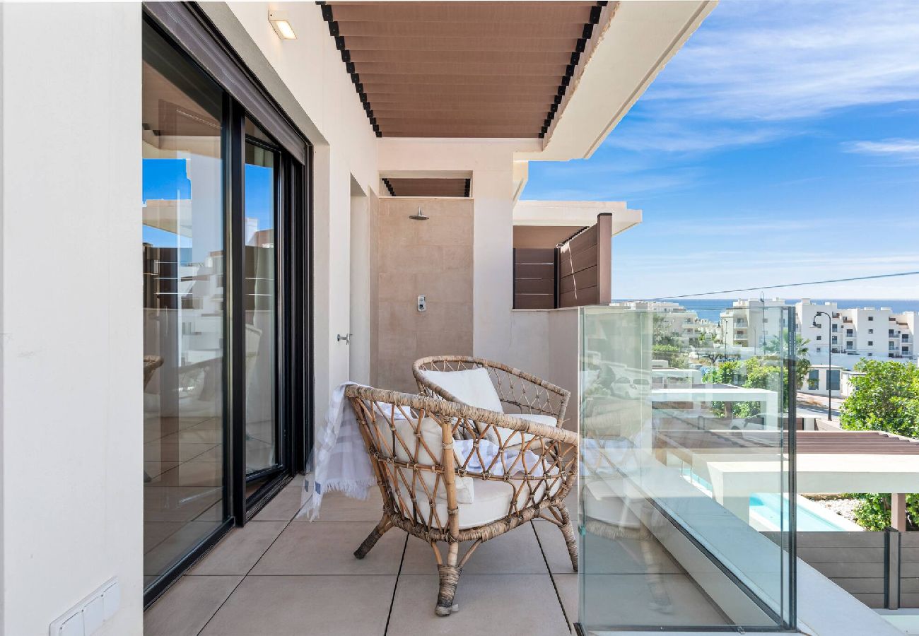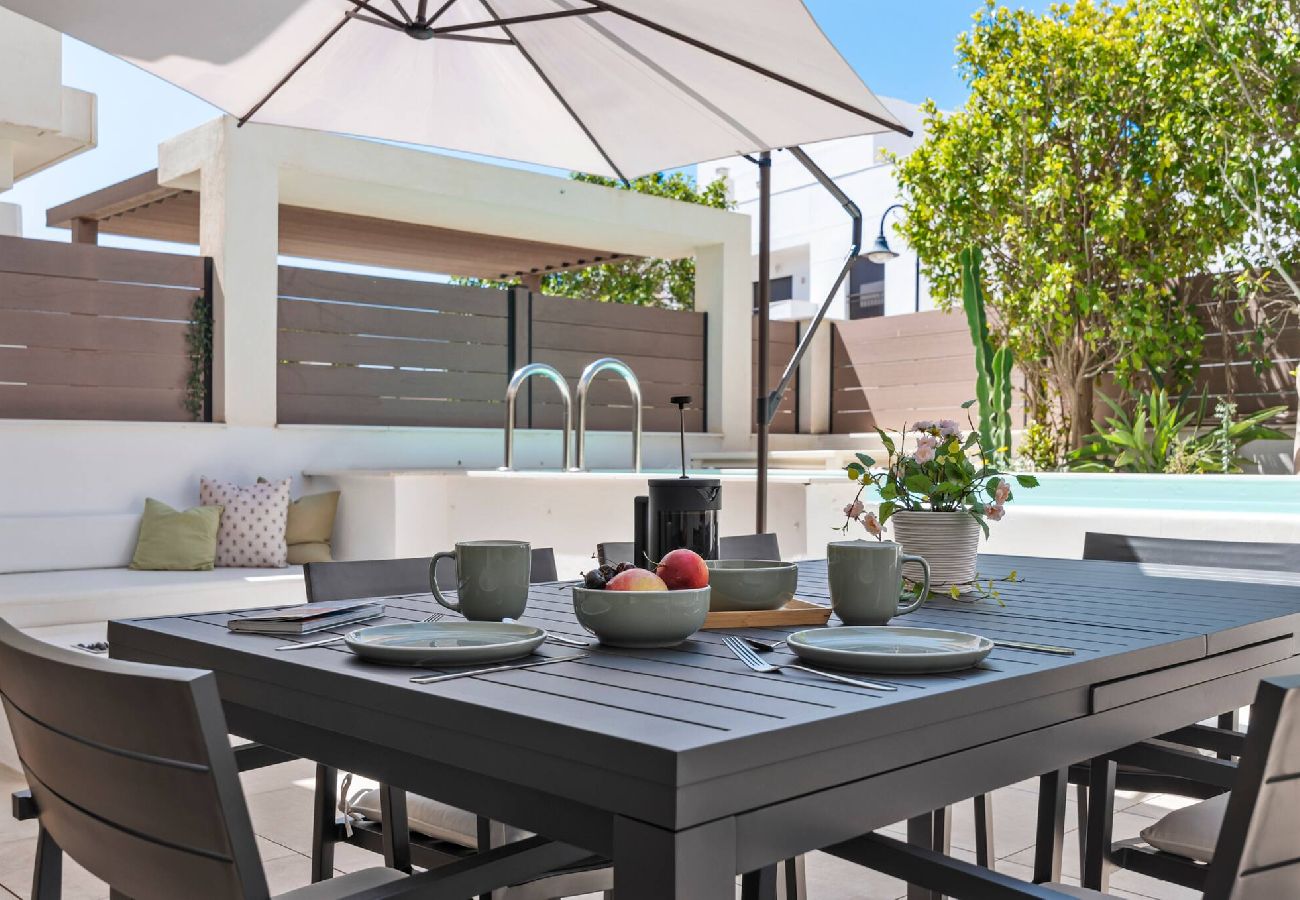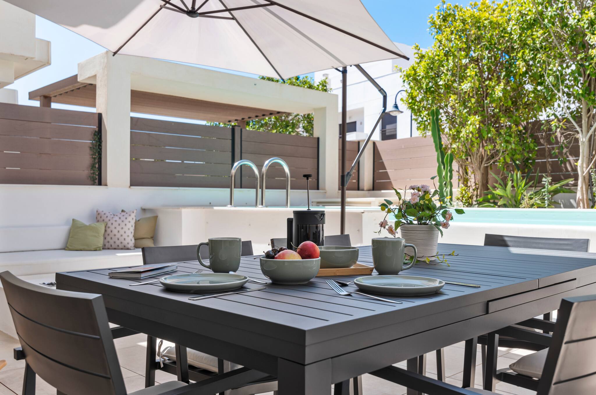 Entra y experimenta cómo el diseño diáfano y los acabados de primera crean una atmósfera luminosa y espaciosa en toda la vivienda. Ya sea que estés descansando en la zona de estar confortable, disfrutando de una comida en el elegante espacio de comedor o preparando snacks en la cocina totalmente equipada, tanto en el interior como en el exterior, cada rincón de esta casa adosada ha sido diseñado pensando en la relajación. En la planta superior, encontrarás una terraza tranquila en la azotea donde podrás tomar una copa por la noche y disfrutar del entorno pacífico.